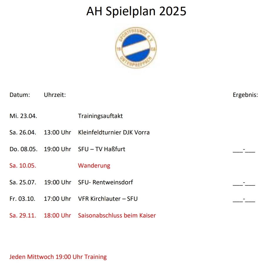 Das Training der Alten Herren findet jeden Mittwoch um 19:00 Uhr statt. Die Freundschaftsspiele werden in unregelmäßigen Abständen ausgetragen. Siehe hierzu den AH-Spielplan.